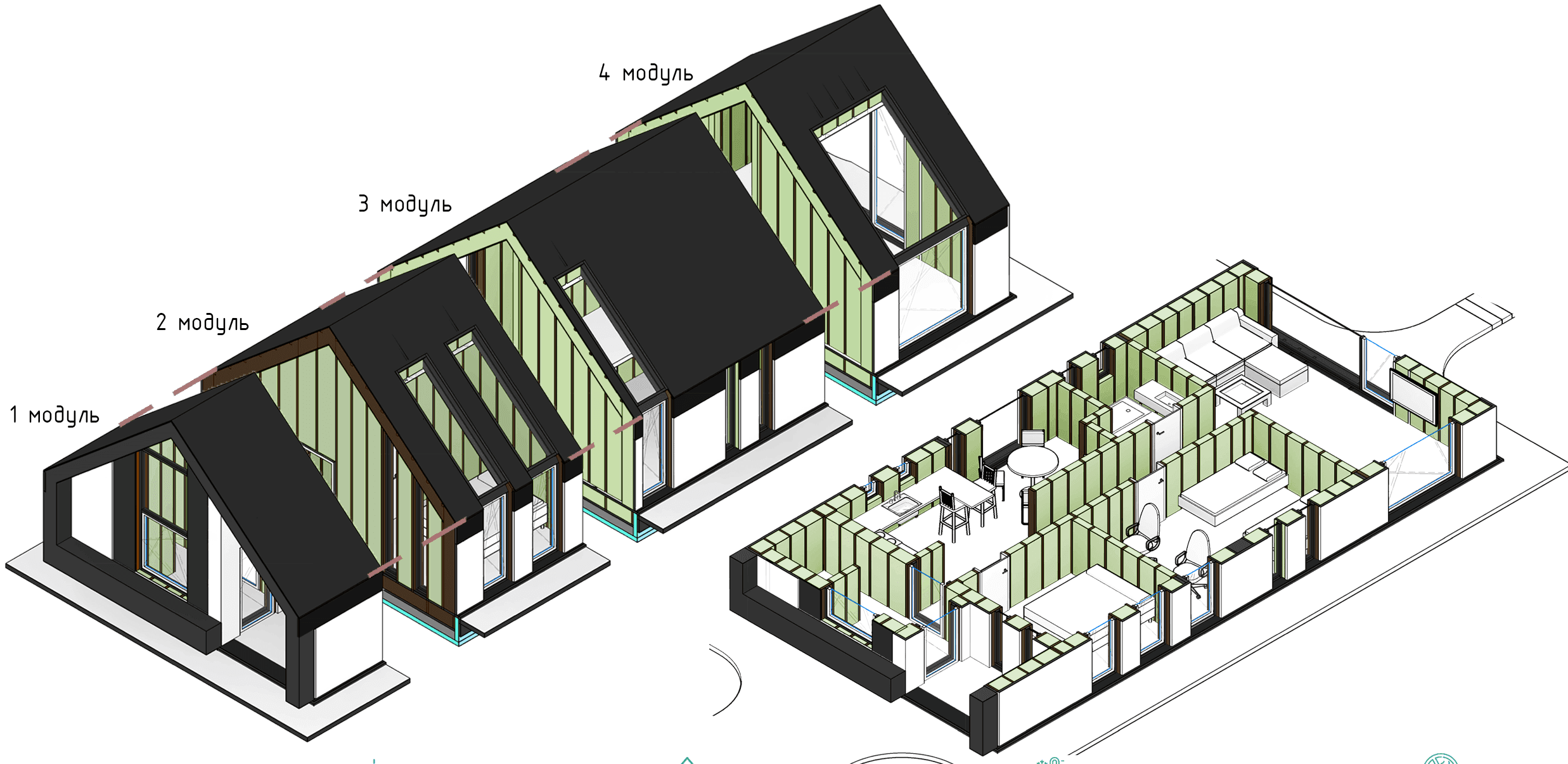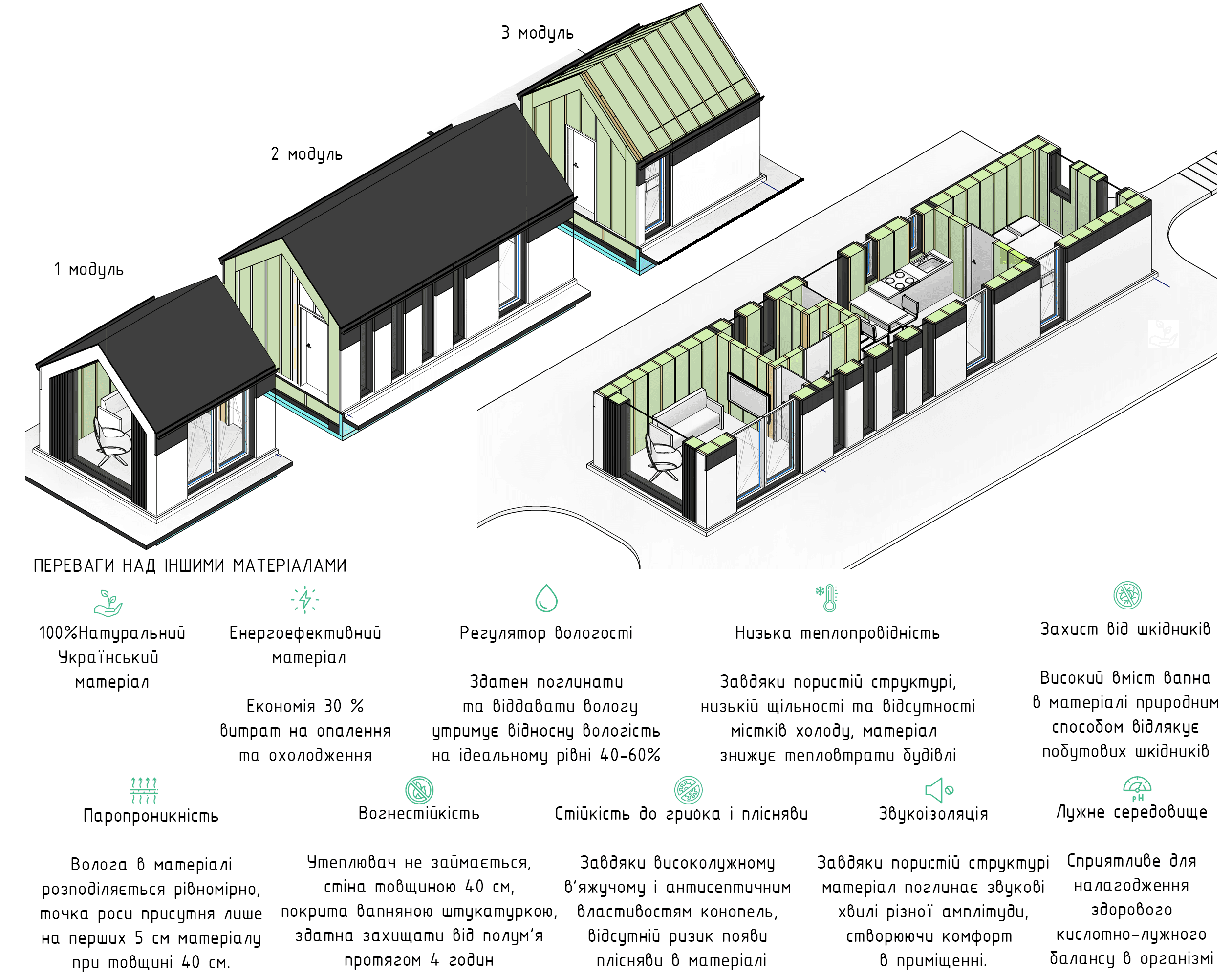 Проєкт поєднує компактність, функціональність і екологічність, пропонуючи житло, яке легко масштабується та може використовуватися як для постійного проживання, так і як швидке рішення для індивідуального або малоповерхового будівництва. Основний фокус зроблено на безпечних природних матеріалах і довготривалій якості простору.