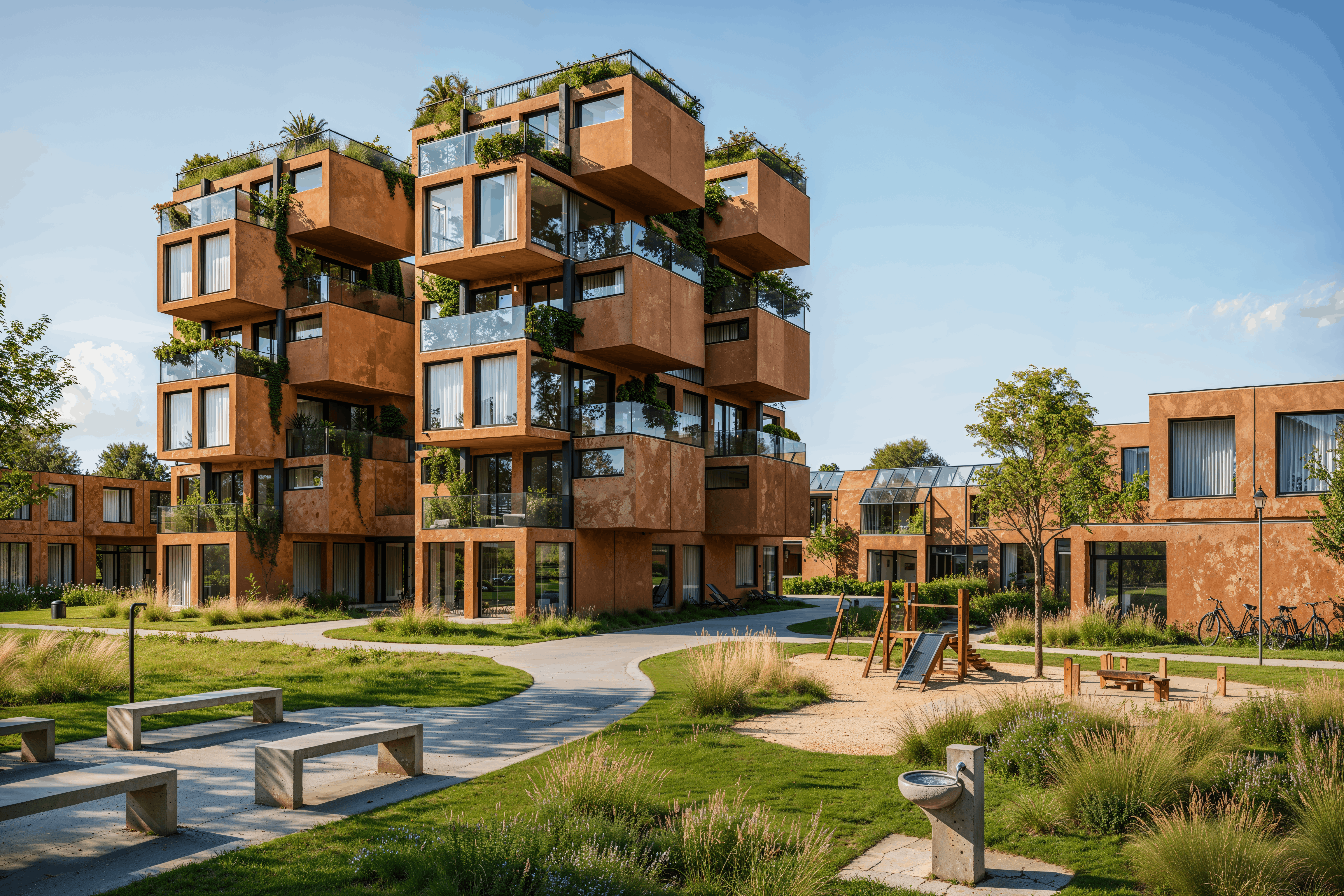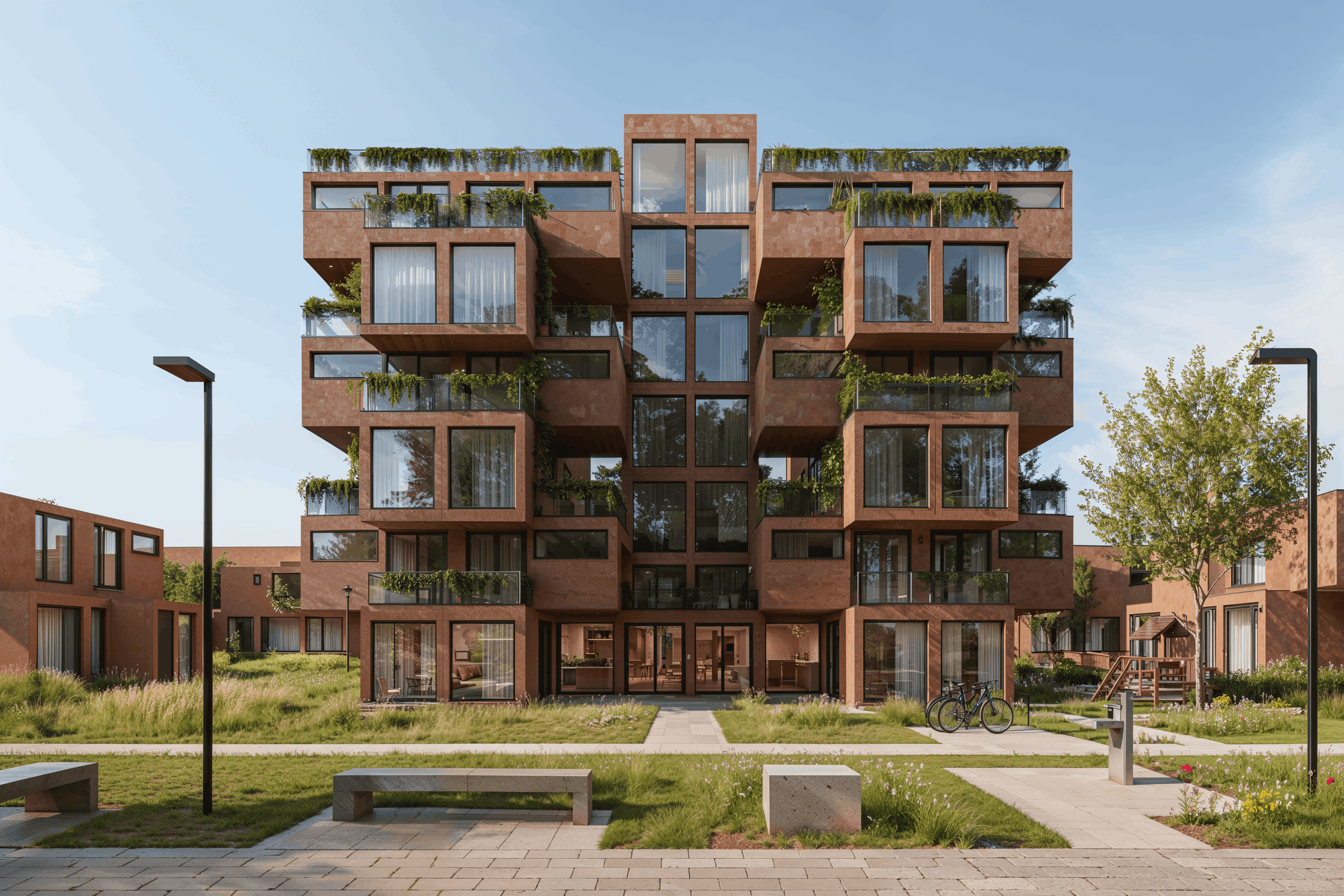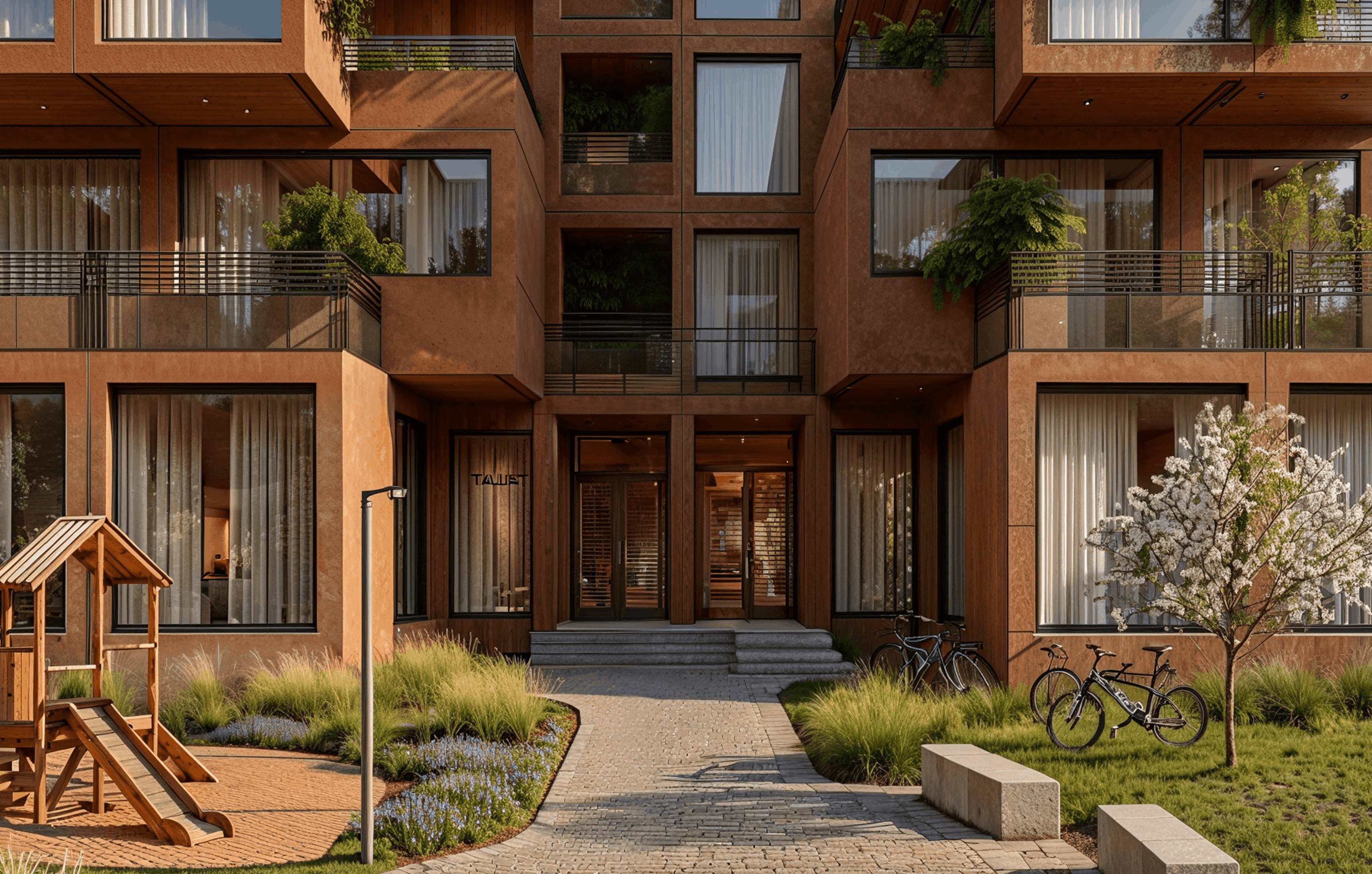 Фасадні рішення можуть бути виконані у відтінках, характерних для Херсона, півдня, щоб навіть нове та тимчасове житло зберігало зв’язок із місцем і пам’яттю міста.