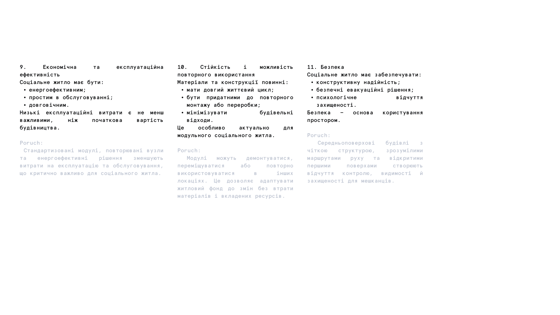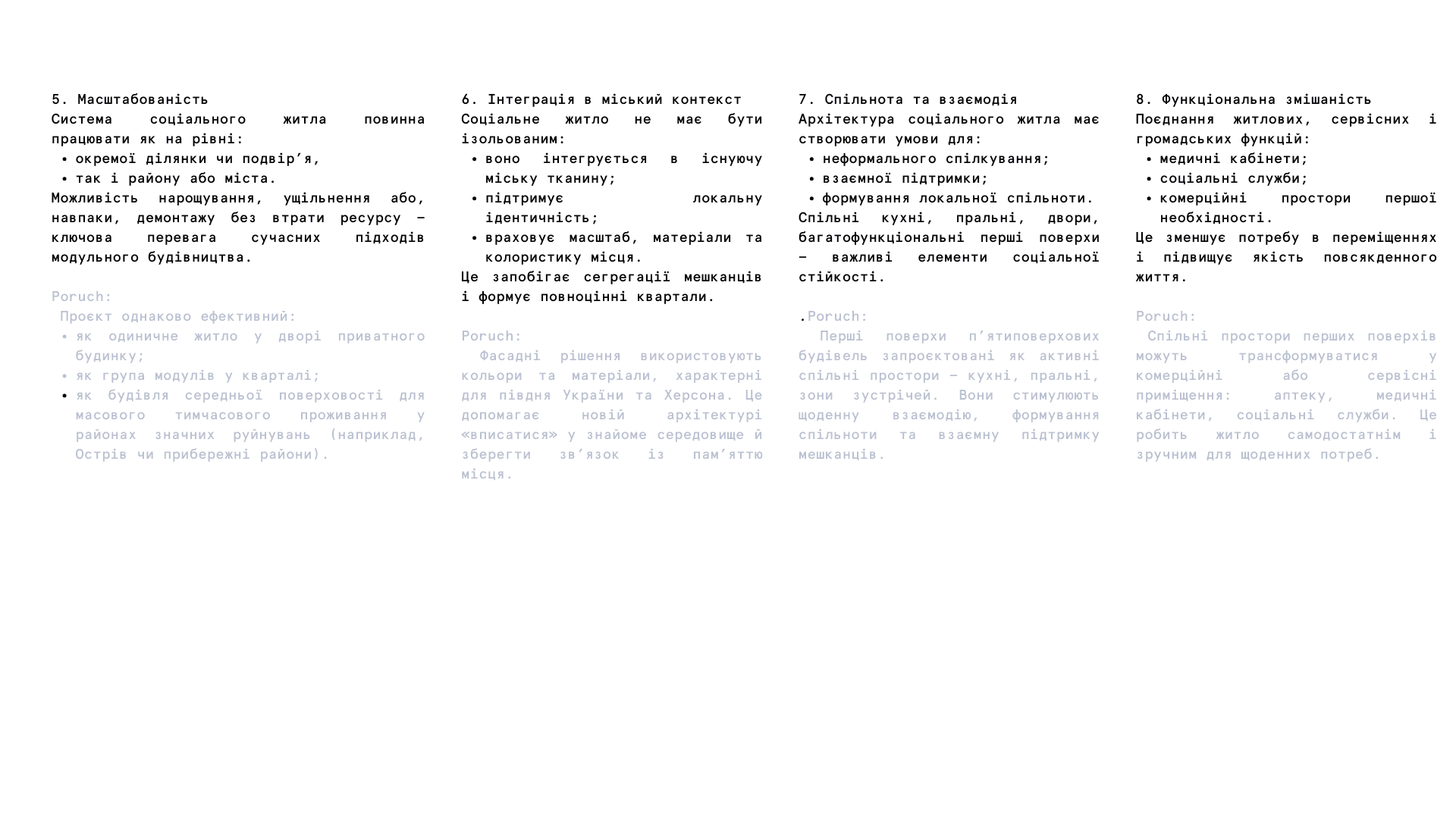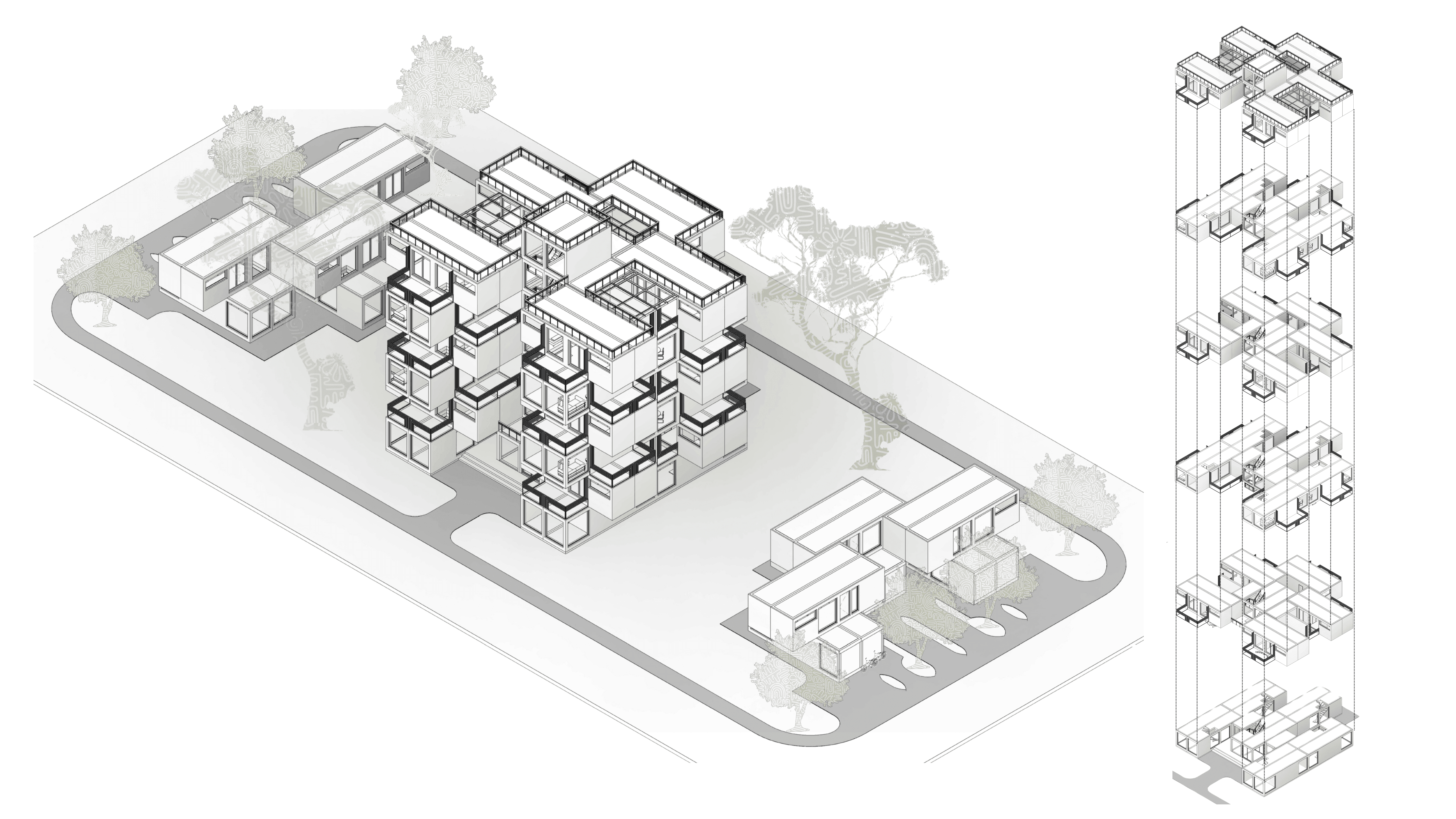 Проєкт модульного соціального житла побудований на системі блок-модулів кількох типів. Вони можуть існувати як автономні невеликі одиниці для життя, а також об’єднуватися між собою, формуючи апартаменти або житло типу колівінгу — залежно від потреб людей і масштабу ділянки, де є необхідність у розміщенні.