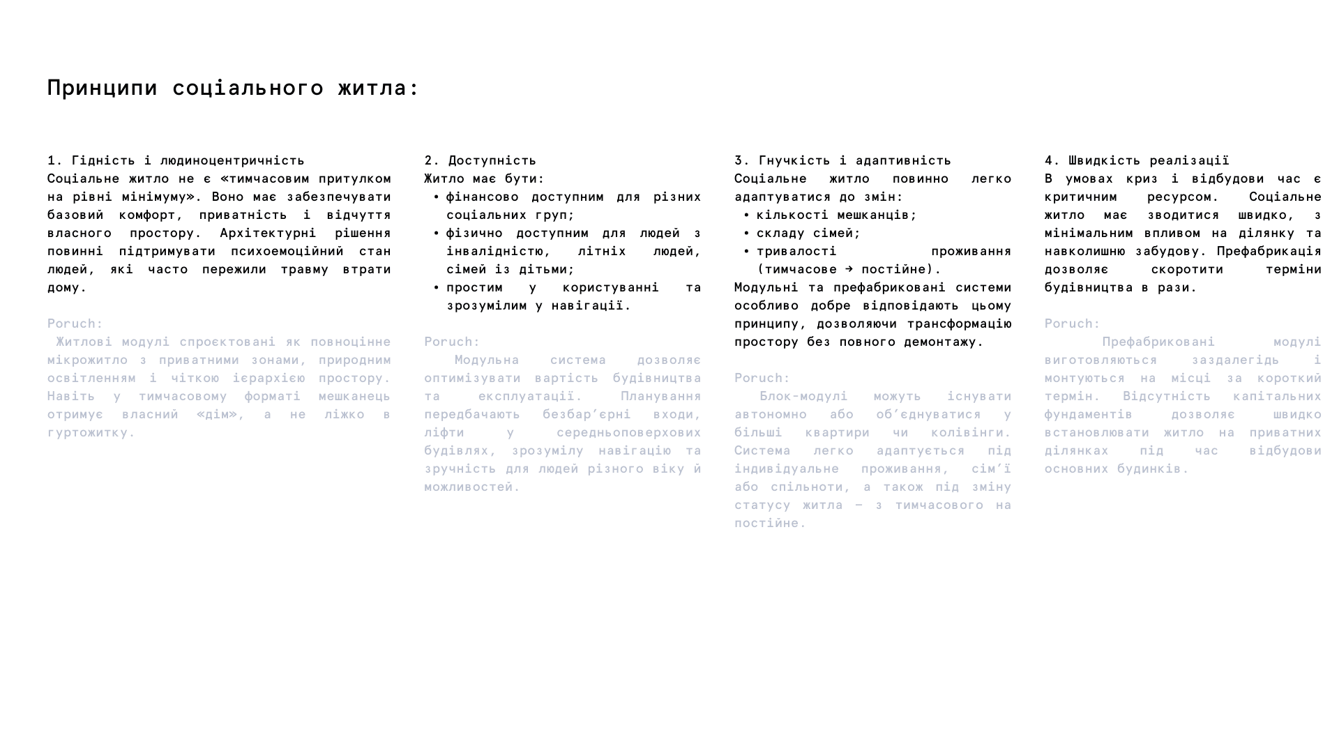 Poruch відповідає на одну з найгостріших проблем сьогодення — потребу в житлі для людей, повернення додому яких наразі неможливе через руйнування. Модульні будинки можуть зводитися швидко, без капітальних фундаментів і розміщуватися на ділянках приватних будинків, що перебувають у процесі відбудови, як тимчасове рішення.